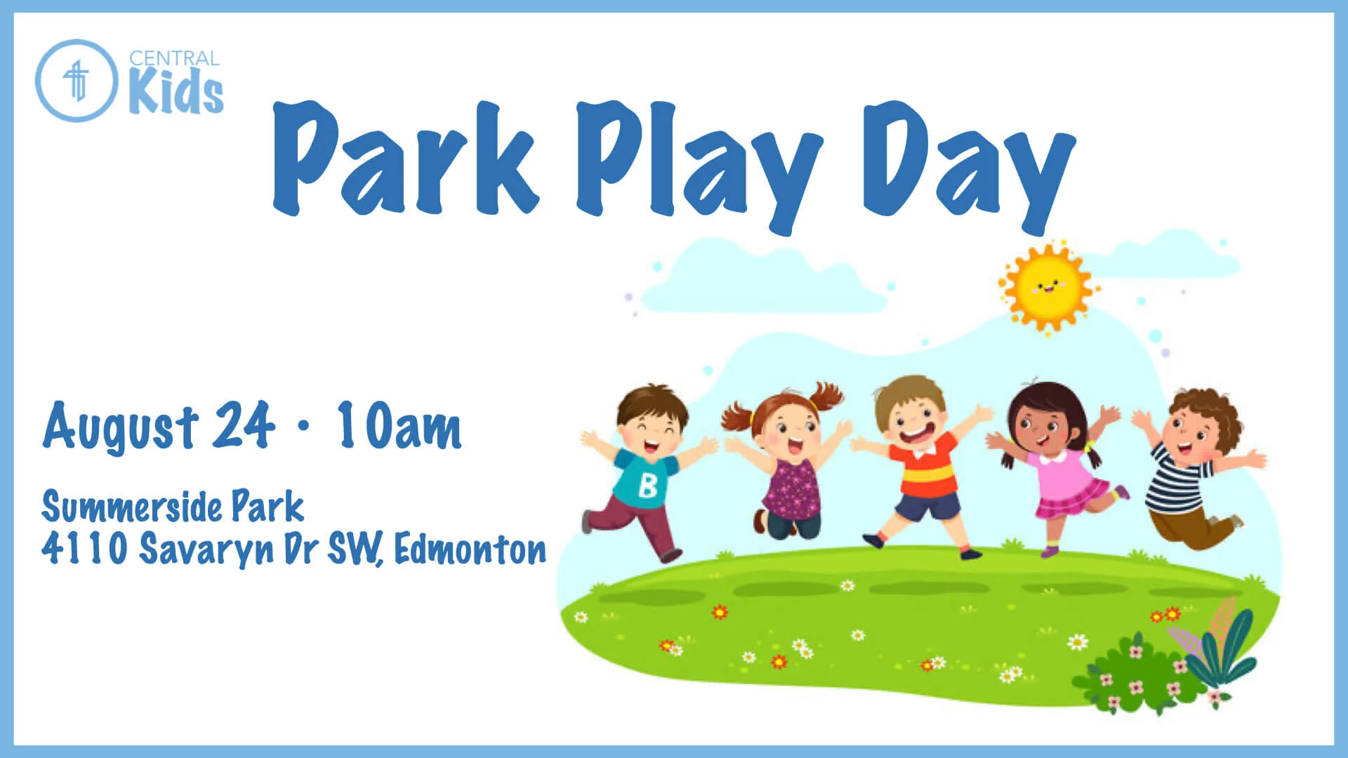 Join us on Tuesday, August 24th at 10am for our next Central Kids Park Play Day at Summerside Park in Edmonton. We will play some games, read a story, maybe do a craft and have fun at the park. Make sure to invite some friends!