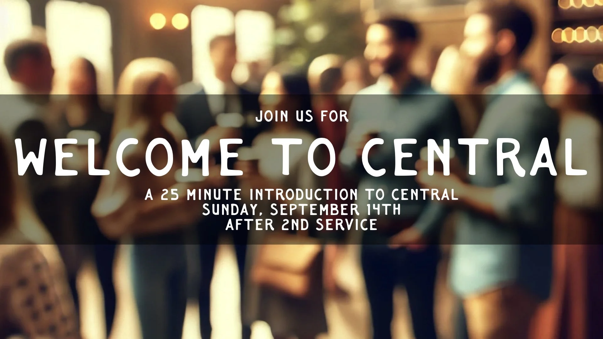 Are you new to Central? Wanting to learn more about Central’s vision, the various ministries and events, or to connect with the Site Pastor and others? Join Pastor Chris on Sunday, September 14th for a short introduction to Central, hear the best ways to plug in, followed by a time for Q&A and connecting with others. Our aim is to make it short and sweet (about 25min) immediately after the 2nd service in the Youth Room.